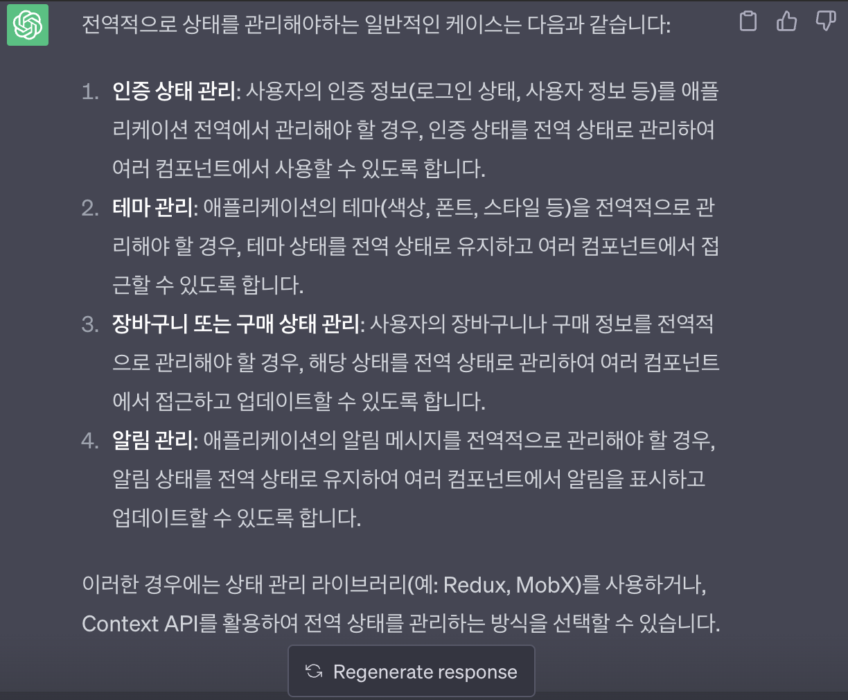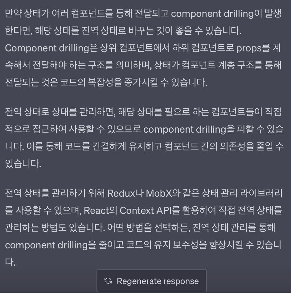 GPT 선생님꼐서도, prop drilling 이 발생한다면 전역 상태로 분리하는것이 좋은 방법이라고 대답을 해주시네요,